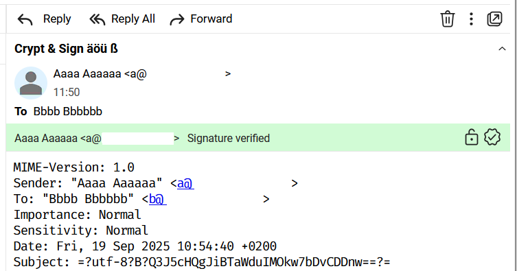 Outlook-Client <-> Outlook-Client funktioniert alles, signiert, verschlüsselt, signiert&verschlüsselt.