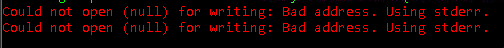 "Could not open (null) for writing: Bad address. Using stderr."