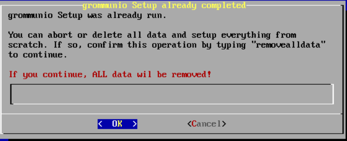 Alf06 haven't checked lastest iso yet, but the definition from setup script define the file that should trigger the cui too. ... if [ -e "/etc/grommunio-common/setup_done" ] ; then DELCONFIRM=$(dialog --no-mouse --colors --backtitle "grommunio Setup" --title "grommunio Setup already completed" --cr-wrap --inputbox \ 'grommunio Setup was already run. ...
