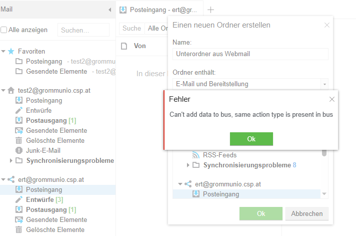 Versuch, in einer freigegebenen Mailbox einen Unterordner anzulegen endet mit "Cant't add data to bus" :